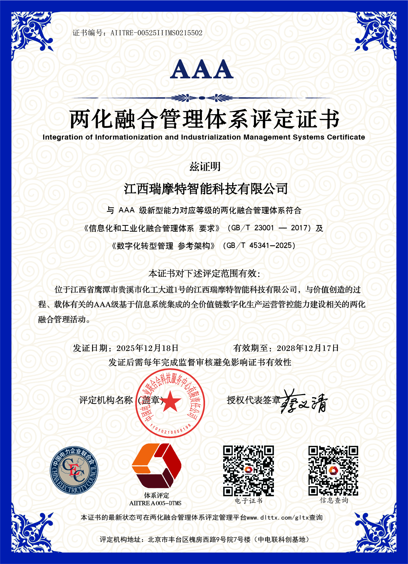 江西瑞摩特智能科技有限公司荣获国家级AAA级两化融合管理体系评定证书。标志着公司在信息化与工业化深度融合方面达到最高标准。